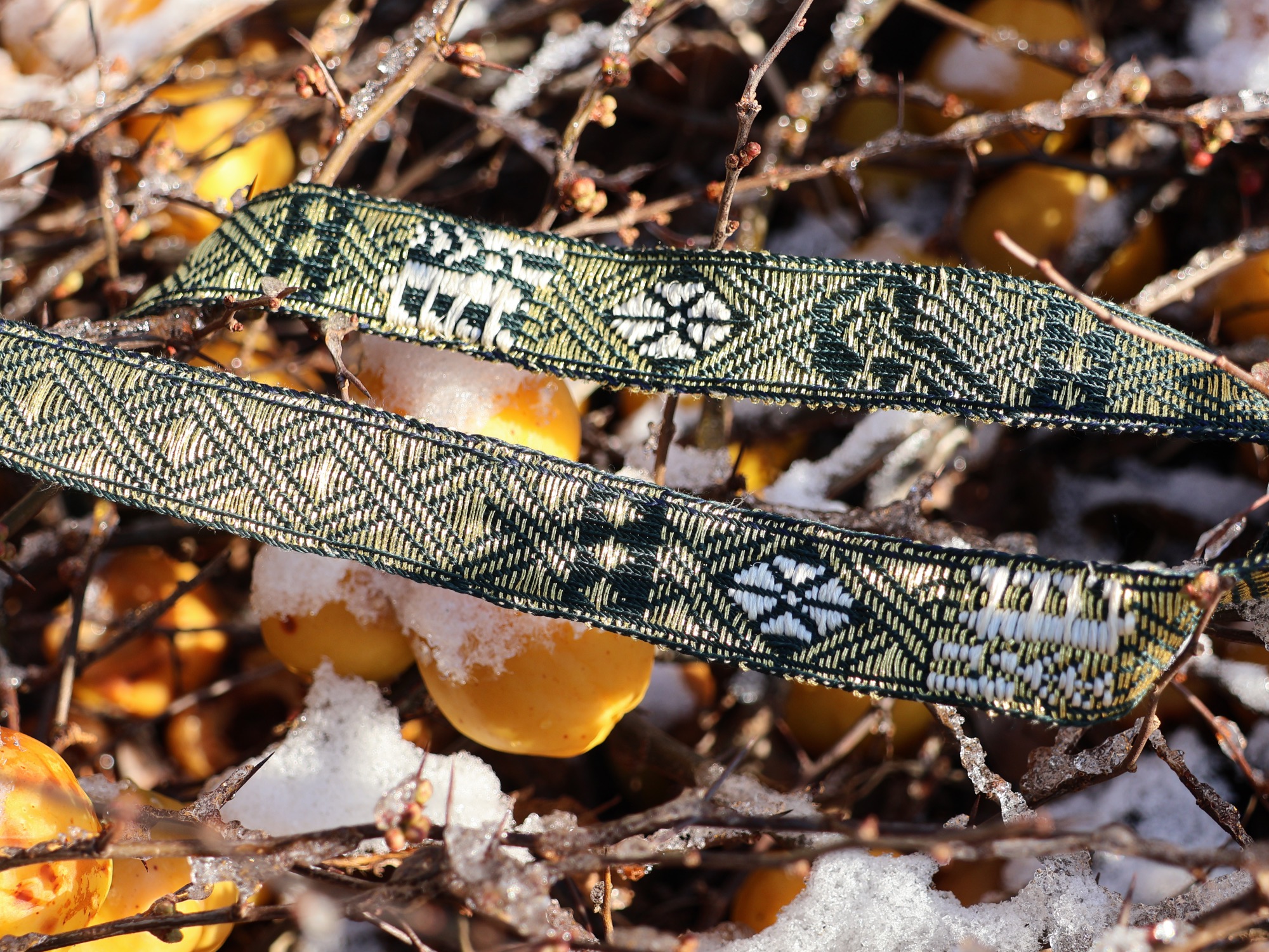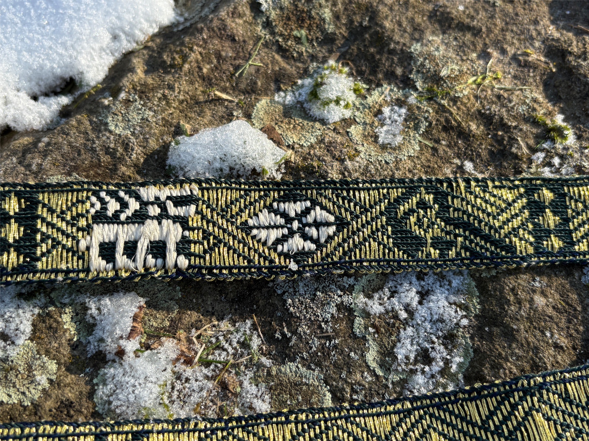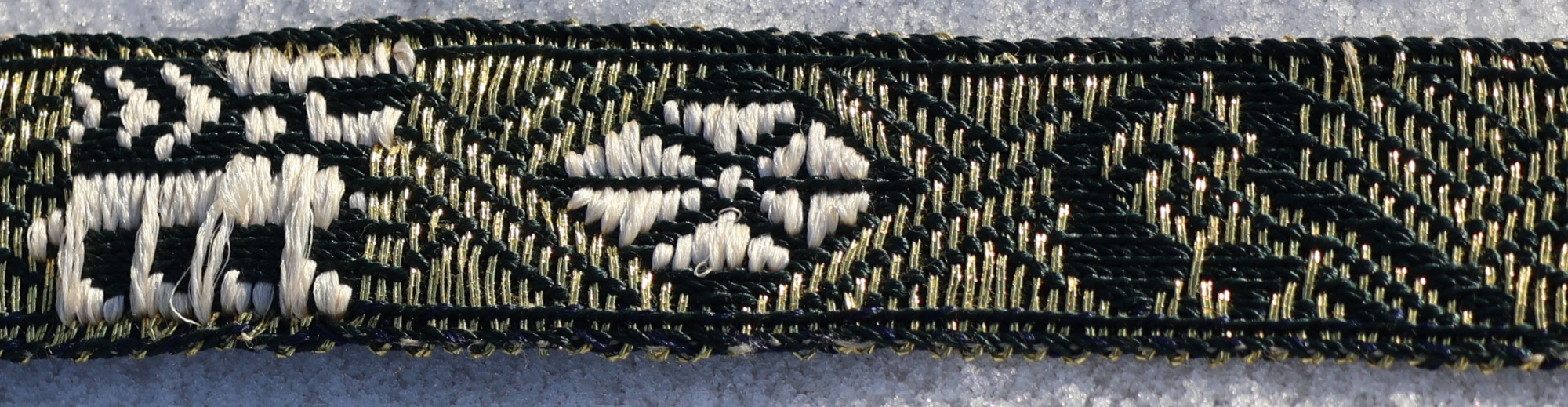 Im Gegensatz zu den anderen Borten, die meisten geometrische, oder florale Motive haben, sind hier auch Tiere gewebt worden. Ein Hirsch und ein Vogel, evtl. ein Rabe.