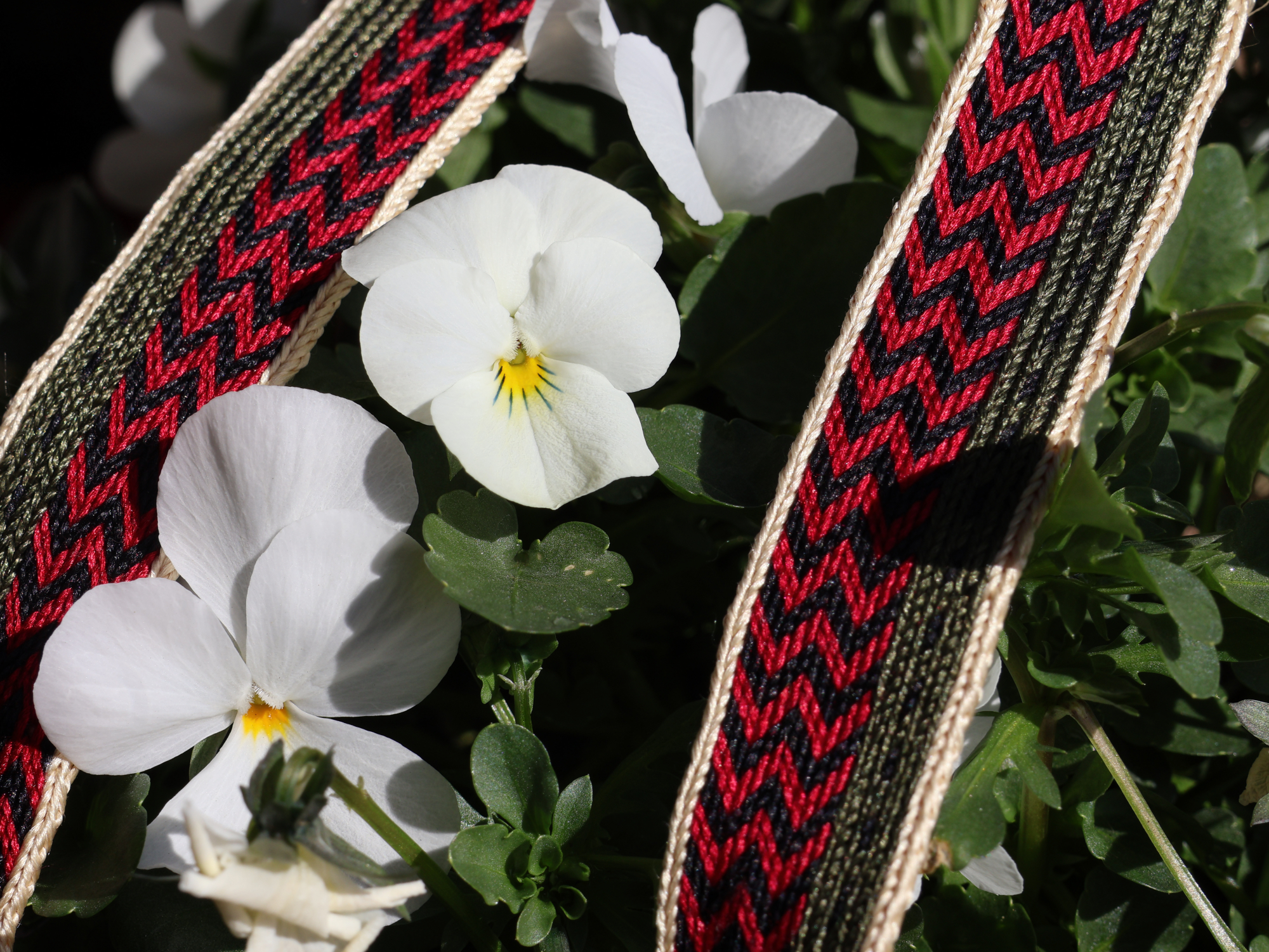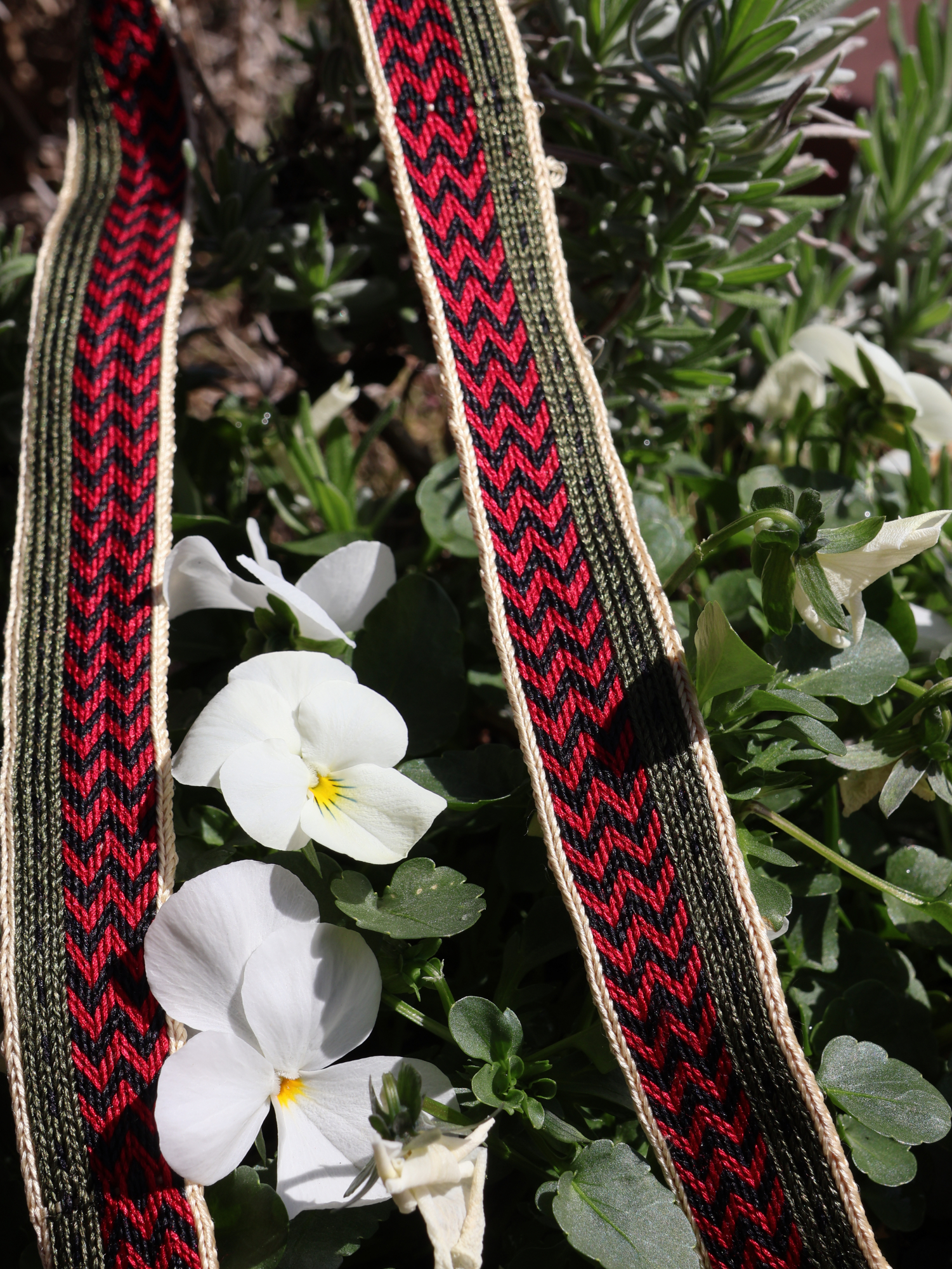 Das Seidenband wurde mit 23 Brettchen gewebt und kontinuierlich in eine Richtung gewebt. Dabei handelt es sich um ein asymetrisches Muster.
